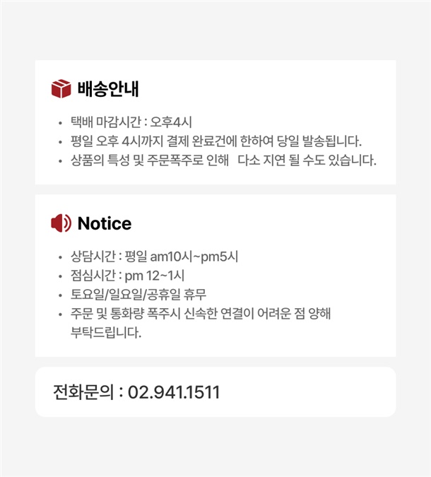 · 배송은 입금확인된 날짜로부터 1~3일 소요되며 최대 7일 이내 출고됩니다. ( 공휴일, 기상악화 등 불가피한 상황에 따라 추가 지연될 수 있습니다.)